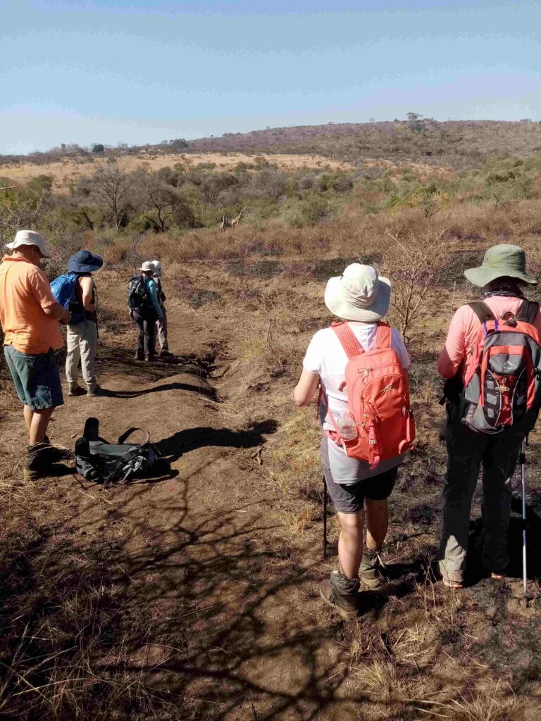 On Sunday 6 August, seven of us set out from the BNR picnic/braai area for a 12km African “safari”. It wasn’t long before we came across some of the local friendly inhabitants – two giraffes and a herd of blue wildebeest. After the initial level stretch the path climbed up to the highest point in the reserve. From there we had an uninterrupted view of the whole reserve and all the way to World’s View and Sweetwaters.