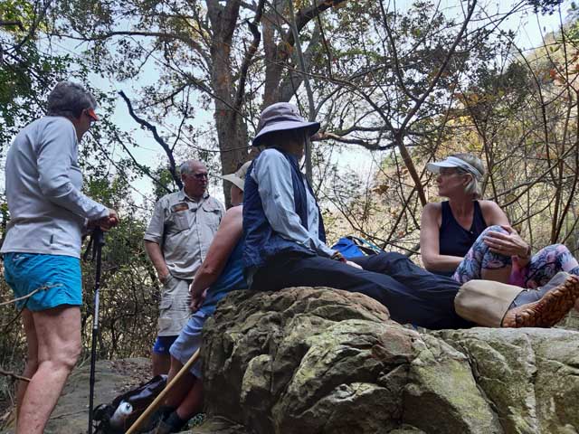 The route to the Waterfall walk, takes in part of the Butterfly walk and branches off down fairly steeply to the path to the bottom of the falls. There were a pair of nesting Egyptian Geese on a ledge high up by the waterfall. Not much water was coming over the falls, but there is a very large pool and we sat amongst the rocks for a tea break. Bruce told us about the cave near the top where archaelogists have found ancient remains.