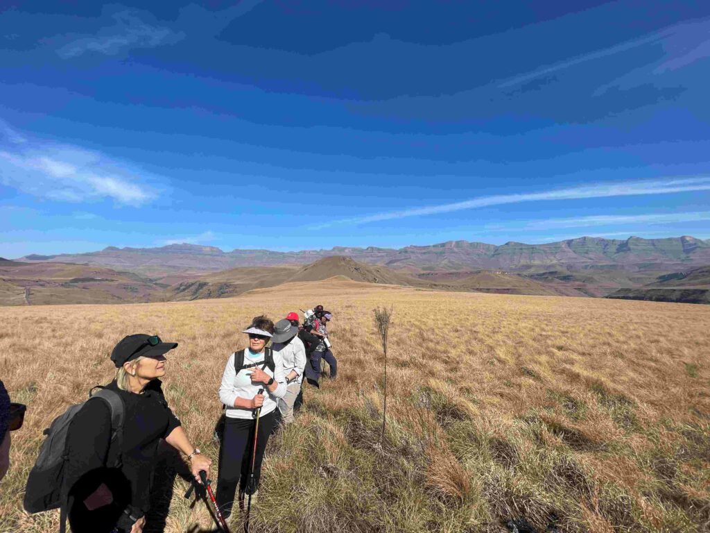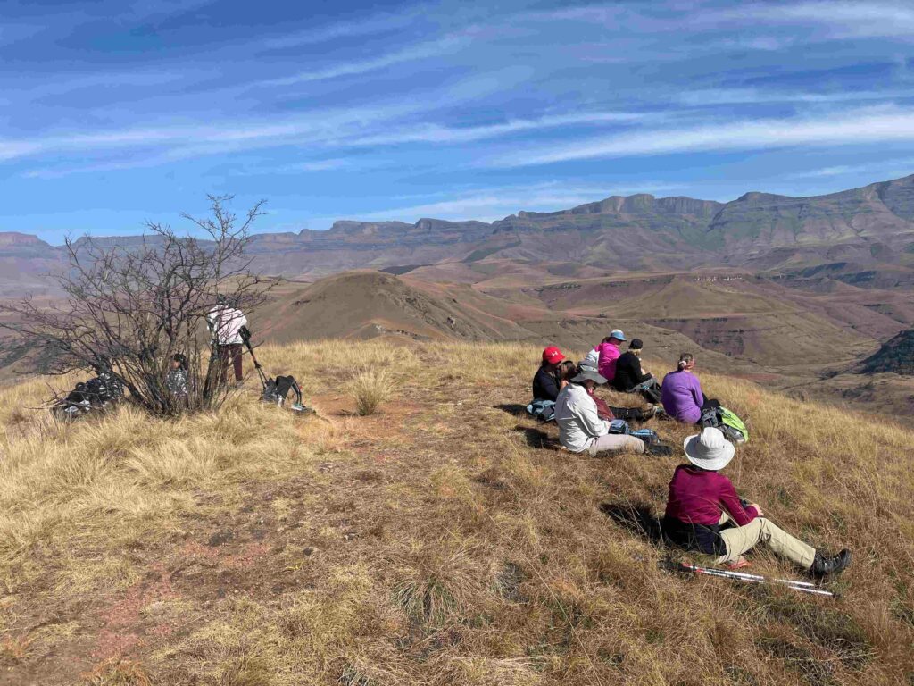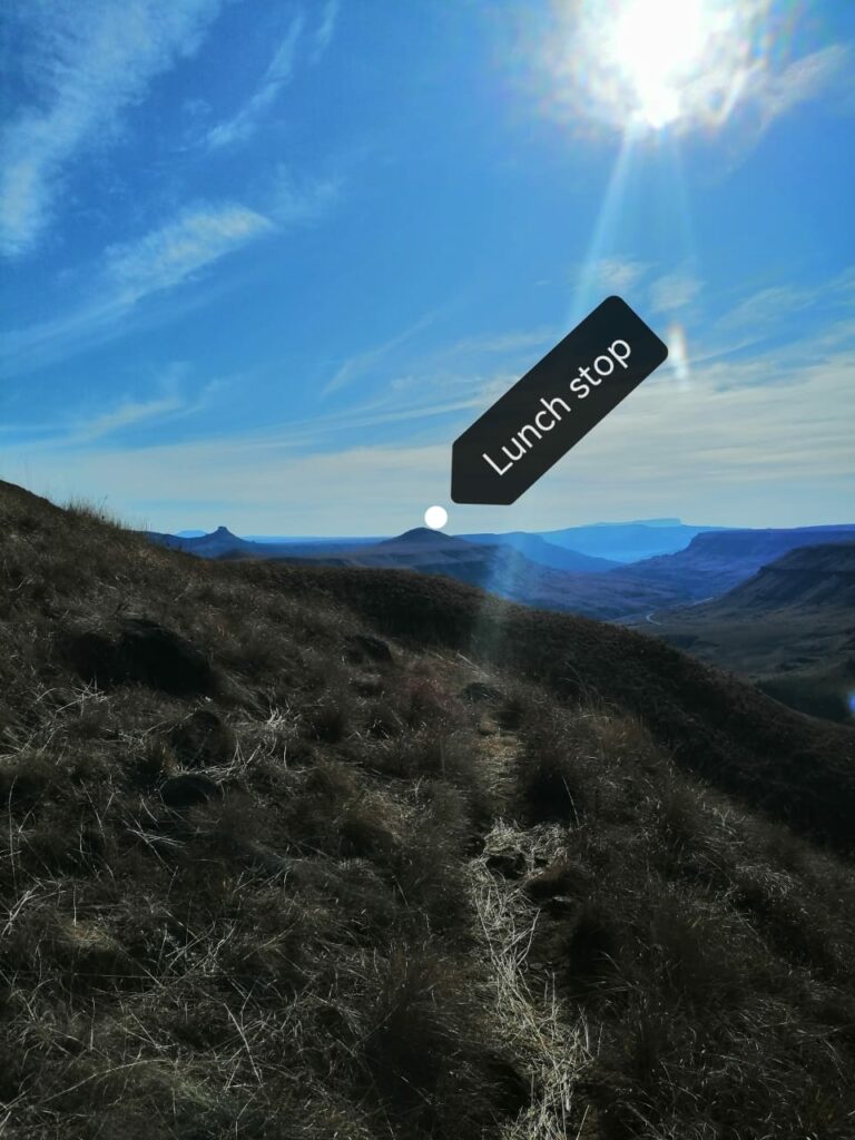 On arriving at the top marked by the only shrub we sat down for lunch as the hike leader took everyone through the various names of the peaks from Giants Castle to Gatberg just showing itself.