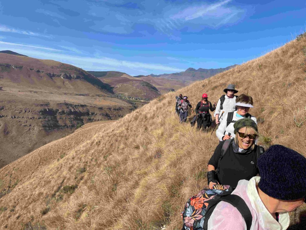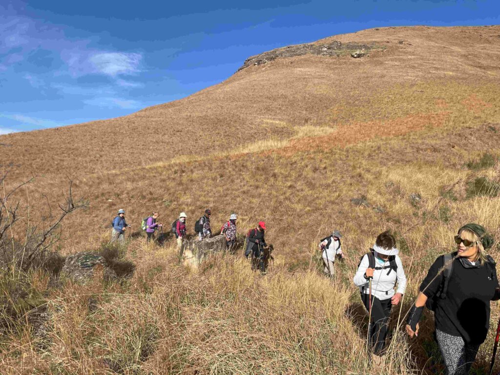 We started up the other side gradually climbing until we had our first break where everyone stripped layers off as we had warmed up after the early morning cold whilst admiring the open grassed area and the Bushman’s river flowing below us now.