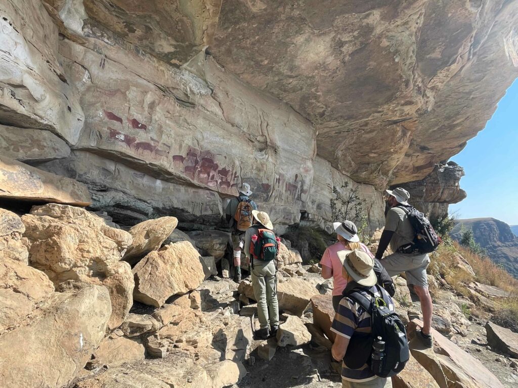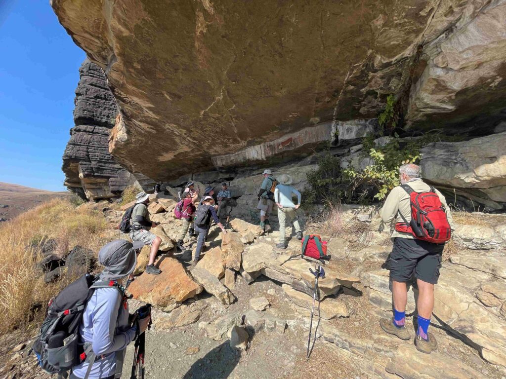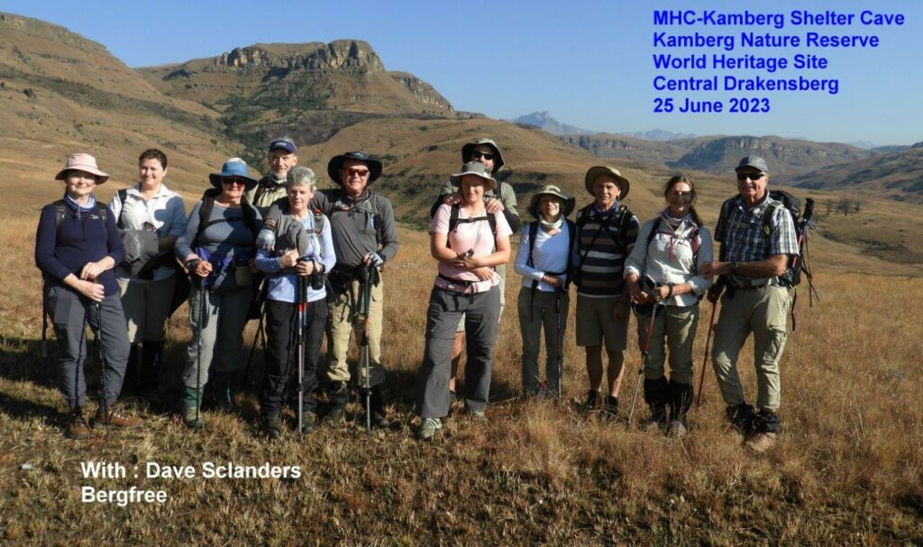 Yesterday, on an unexpectedly mild – short-sleeves and shorts – sunny winter’s day, Dave Sclanders led thirteen of us on a hike to fascinating rock art in mountain shelters of the Kamberg Nature Reserve.