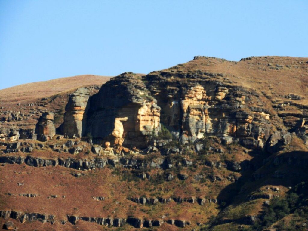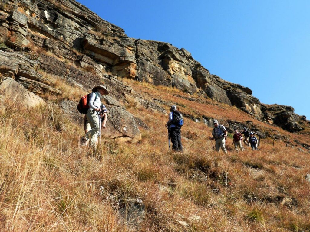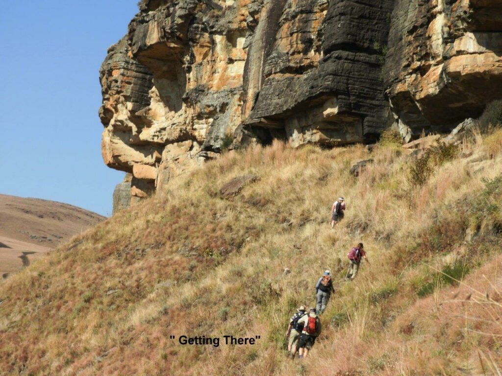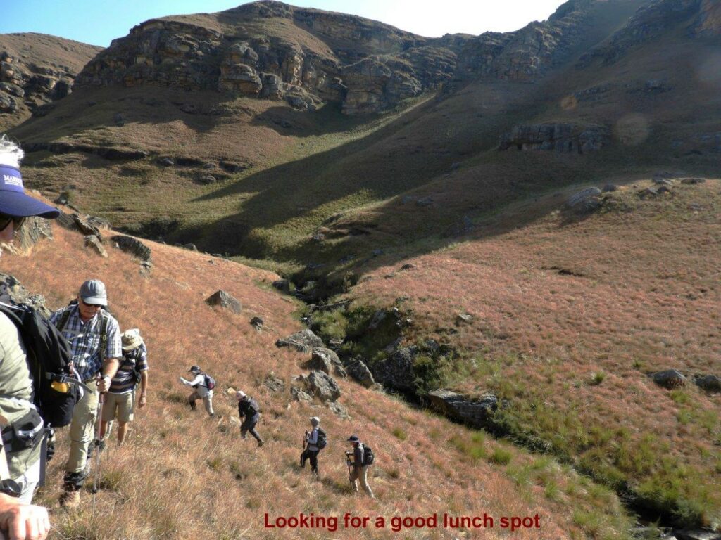 Before we set off , Dave gave an intriguing history of the area and named the peaks and points of interest that lay ahead of us. The geology of the mountain range includes a clearly visible fault-line that runs a distance across the reserve. He also pointed out an interesting juncture or wide-V bend in the Berg formed with Giant’s Castle at the centre, in the near distance. Colourful names, such as Goldilocks and the Three Bears and Gladstone’s Nose, given to rock features, speak of the strong British presence since the 1800s. We were told about the significance of Bushman’s River Pass, visible to the north of Giant’s Castle, and the pursuit of Zulu Chief Langalibalele by Major Anthony W. Durnford (later Colonel) , 55 Officers and men of the Natal and Karkloof Carbineers and 25 Basuto and a Native Interpreter .