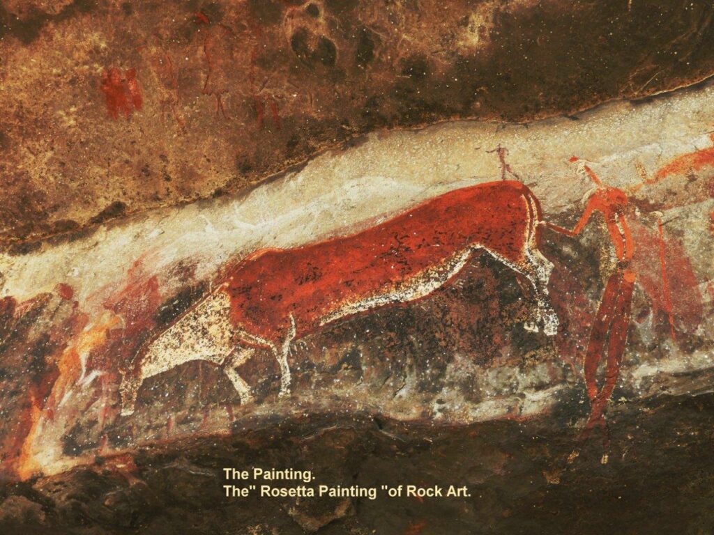 Fine “brushes” from coarse animal hair and smearing by hand are said to have been the means of application. Various theories have been offered for why images were painted over existing ones including the possibility that when a shaman died his successor could overlay earlier painting. The ritual art we saw did not show foreshortening or perspective as is the case in some of the other Berg rock art. Underlying images seem to be more simple than the superimposed ones and not an attempt at depth.