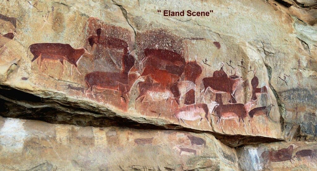 This shelter, like the next one we visited, depicts eland, buck, shamans and bushmen hunters in various degrees of artistic sophistication. The second shelter, closer to the crest of the mountain and rightly celebrated, is suggestive of four phases of skill, from simple monochrome and outlined images to poly-chrome, 3-dimensional and skilfully shaded images. The substances used have been identified as finely crushed rock of various colours (mostly ochre, browns, white and what modern artists would call shades of ox-blood red), blood and fat.