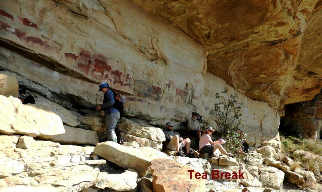 After about three kilometres of easy contour paths, we climbed to the first overhang where rock paintings are to be found. From above the roof of the shelter a narrow stream flowed down in front of us as a waterfall.