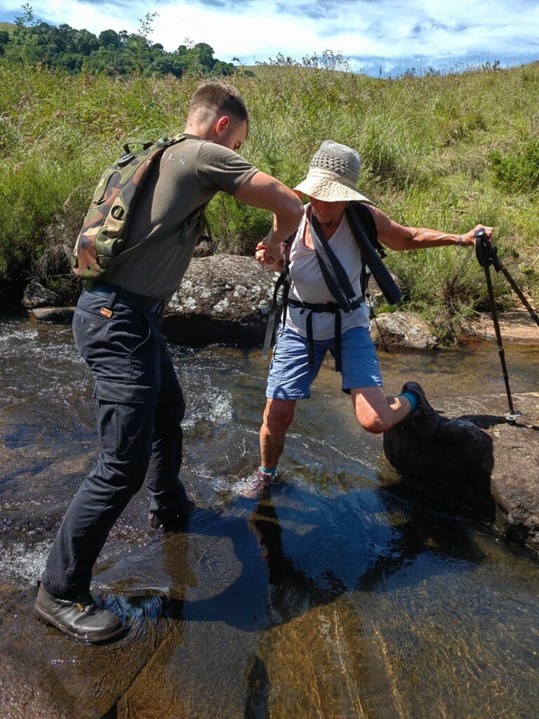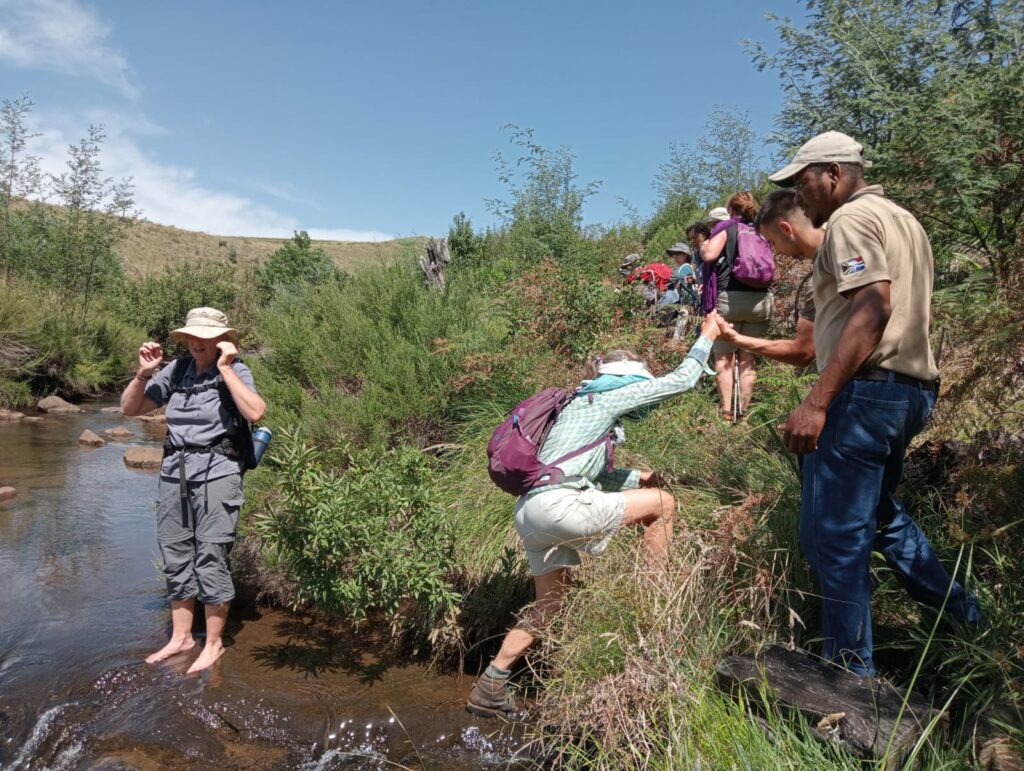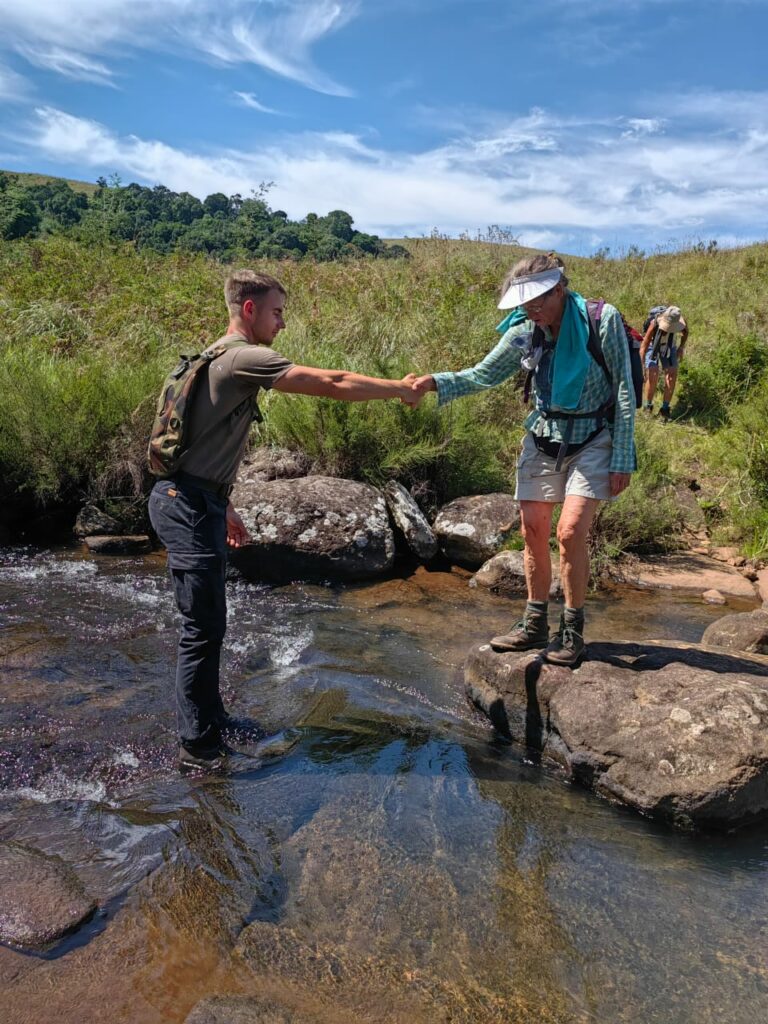 A full river crossing with flat stepping stones and big rocks. Spamandla and Fabio willingly assisted and no one fell in!